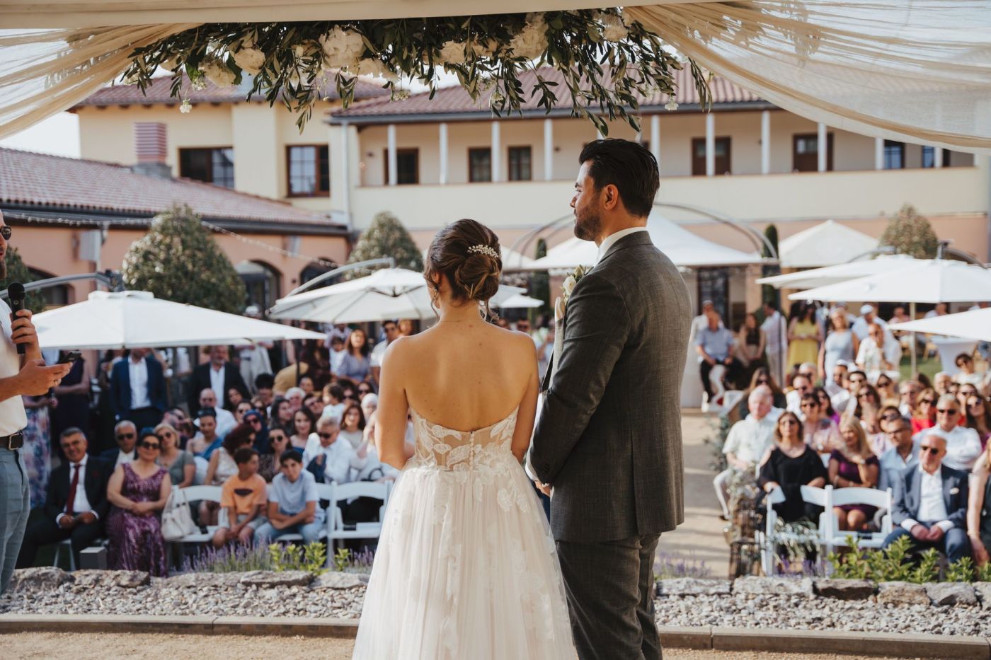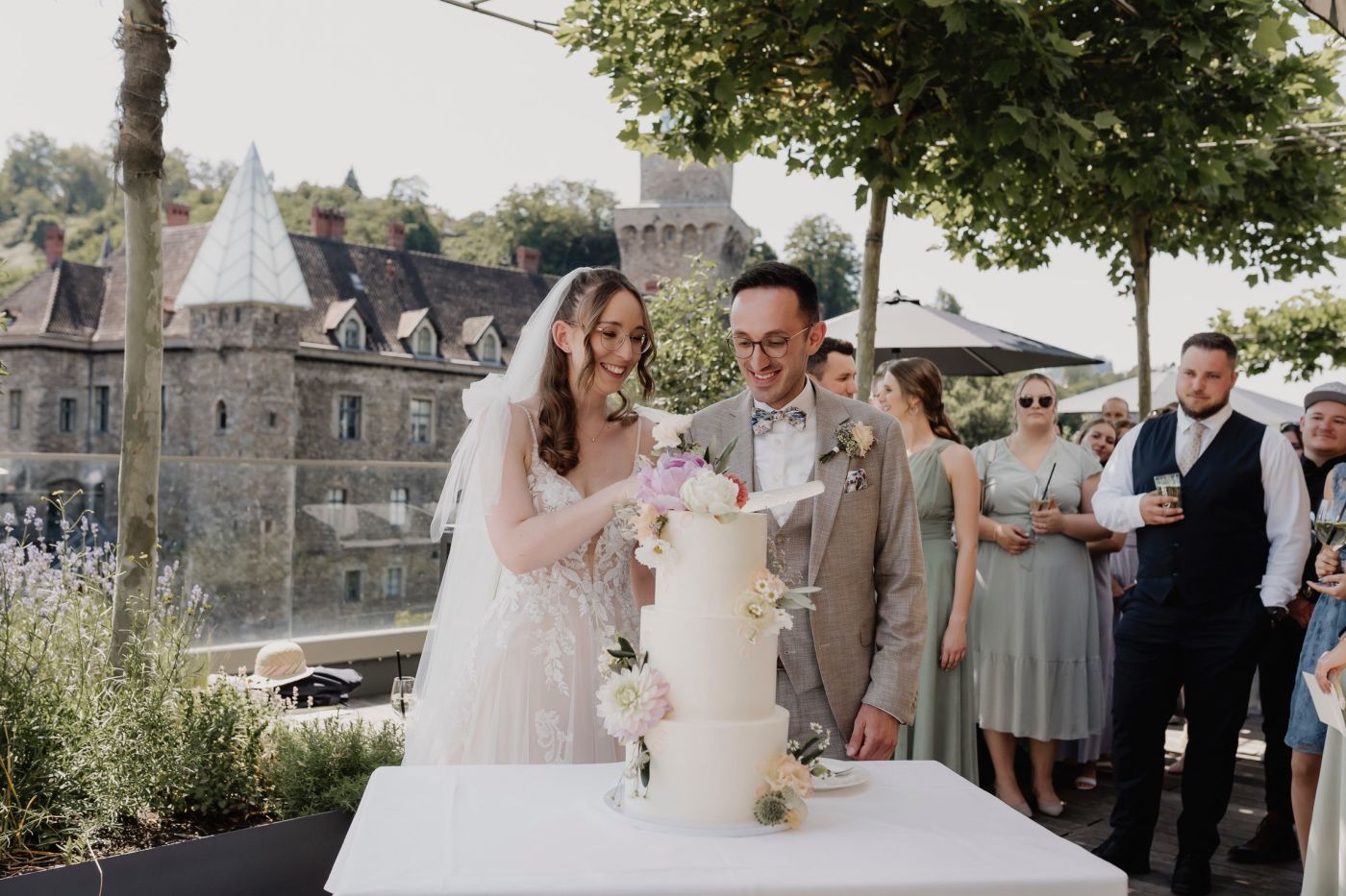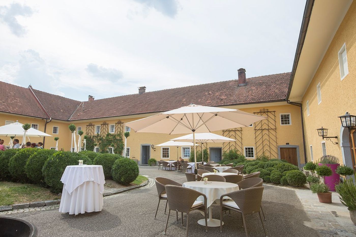 Wir waren Gäste, fühlten uns jedoch wie das Brautpaar! Sehr aufmerksames Personal. Ganz zu Schweigen vom traumhaften Ambiente. Bei tollem Wetter wurden wir herzlich im Innenhof empfangen. Da abgegrenzt, mit eigener Kapelle, konnte intim (ohne lästige Zuschauer) die Trauung und Feier genossen werden. Ausblick ins Grüne und die gesamte Anlage mit Blumen, Bäume und Weinberg bleibt unvergesslich. Würde sofort dort selber heiraten
