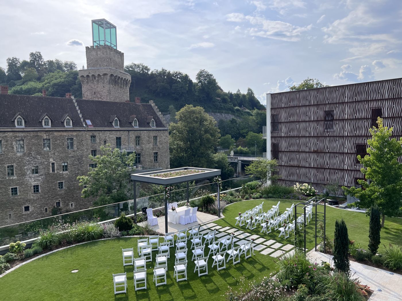 Die Location ist atemberaubend – umgeben von wunderschöner Natur und mit einem Blick auf die Stadt, der einfach unvergesslich ist. Die Atmosphäre war perfekt für unseren besonderen Tag. Besonders hervorheben möchten wir das fantastische Team, das uns betreut hat. Jeder war extrem professionell, freundlich und aufmerksam, und sie haben wirklich alles getan, damit wir und unsere Gäste uns rundum wohlfühlen. Die Planung und der Ablauf waren absolut reibungslos, und wir haben uns stets in den besten Händen gefühlt. Die Räumlichkeiten sind modern und stilvoll, und die Außenbereiche bieten großartige Fotospots und viel Platz zum Feiern. Wir können diese Location nur jedem empfehlen, der nach einem außergewöhnlichen Ort für den schönsten Tag im Leben sucht. Herzlichen Dank an das ganze Team