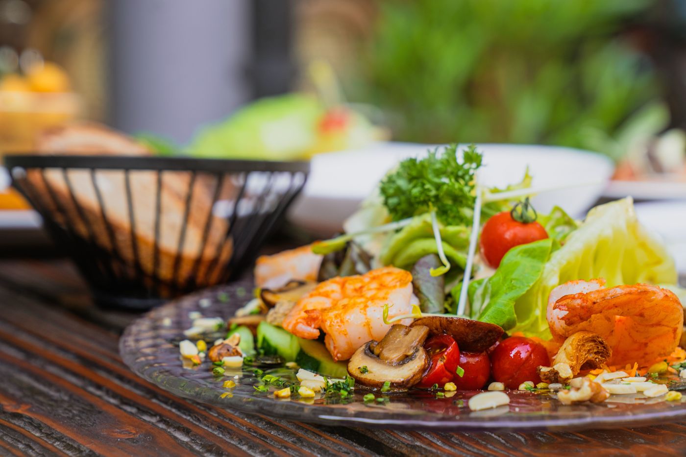 Tolles Essen und traumhaftes Ambiente bei tollem Wetter auf einer wunderschönen Terasse. Entspannte Atmosphäre und toller Service