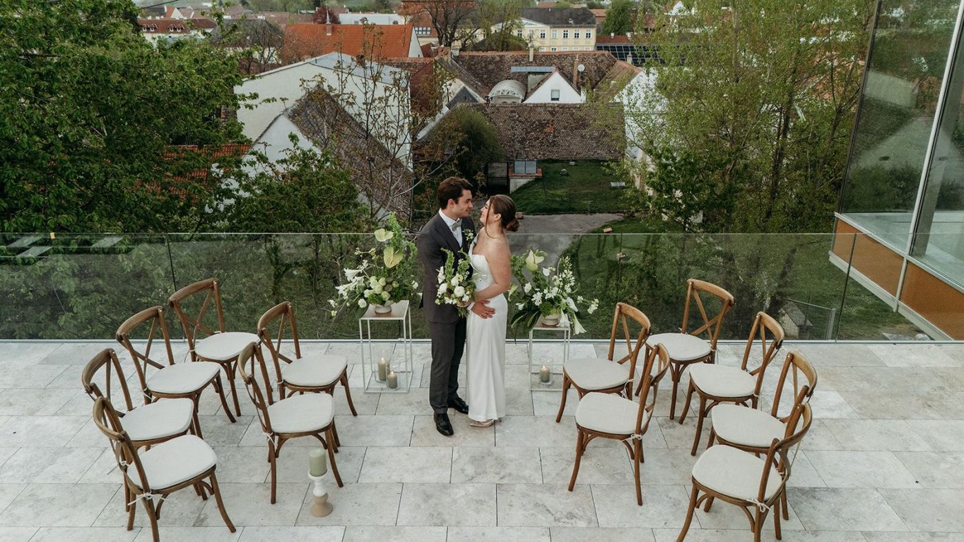 für den unvergesslichen Rahmen, den ihr für unsere Hochzeit geboten habt. Das wunderschöne Wetter hat die Location an diesem besonderen Tag noch einmal mehr erstrahlen lassen – und unsere Gäste waren durch die Bank weg beeindruckt. Vom eher unscheinbaren Eingang bis hin zu dem Moment, in dem sich ihnen der Blick über Wien eröffnet hat – alle waren einfach "baff". Die Kombination aus Stadtpanorama, stilvollem Ambiente und eurer liebevollen Gestaltung war wirklich einzigartig. Ein ganz großes Kompliment auch für die perfekte Organisation: Schon der erste Anruf war unkompliziert und sympathisch – und dieser Eindruck hat sich bis zum letzten Drink an der Bar nur bestätigt. Alles war reibungslos, herzlich und professionell. Ein besonderer Dank gilt dir Silvia für die wunderbare Gesamtkoordination und Benjamin, der während der Feier ein großartiger Ansprechpartner für uns war – präsent, hilfsbereit und immer mit einem Lächeln. Danke, daß ihr diesen Tag für uns so besonders gemacht habt! Herzliche Grüße W&S